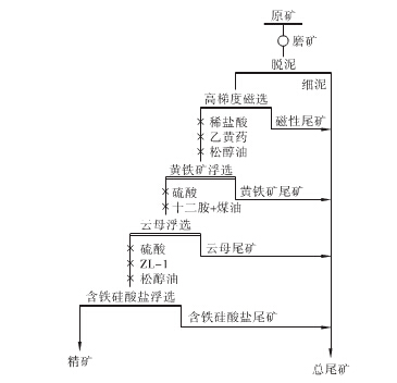 長石礦石中的鐵主要賦存在云母,鐵礦物、黃鐵礦、含鐵堿金屬硅酸鹽中,采用鐵介質(zhì)磨礦過程中也會帶入部分機械鐵,這些含鐵雜質(zhì)可通過脫泥,磁選、浮選等技術(shù)手段脫除。