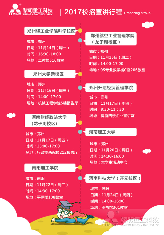 2017年集團公司人才引進統一部署,尋找共同的事業伙伴加入我們。在接下來的一段時間內,黎明重工HR團隊將相繼走進鄭州輕工業學院、鄭州大學、河南理工大學、鄭州航空工業管理學院及河南財經政法大學等知名學府展開2016校園招聘宣講會,歡迎大家參加。屆時您將可以近距離與我們的HR交流更多詳細信息。