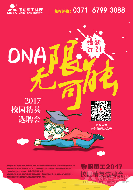 “傲青春·夢想飛揚季”、“傲青春·夢想綻放季”、“下一站,黎明”,“獵新計劃——青年青年站出來”,“獵新計劃——趁年輕,干漂亮的事兒”這些主題鮮明的精英選聘會讓學子們印象深刻。每一場的宣講,每一次的熱忱溝通,每一站的追隨,黎明重工吸引了各大高校佼佼者的加入,成為這個群體中口口相傳的企業。“獵新計劃——DNA創造無限可能”2017年黎明重工校園精英選聘會正式啟動。