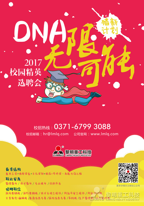 DNA的細(xì)微差別,造就一無二的不同個(gè)體。在黎明重工的文化DNA中,崇尚無限創(chuàng)造的品質(zhì)、尊重每個(gè)人的多元價(jià)值,而敢于發(fā)掘自身無限可能的人,就會(huì)擁有進(jìn)入黎明重工的通行證。2017年,希望你以黎明重工這一站為入口,創(chuàng)造屬于你的無限可能性。