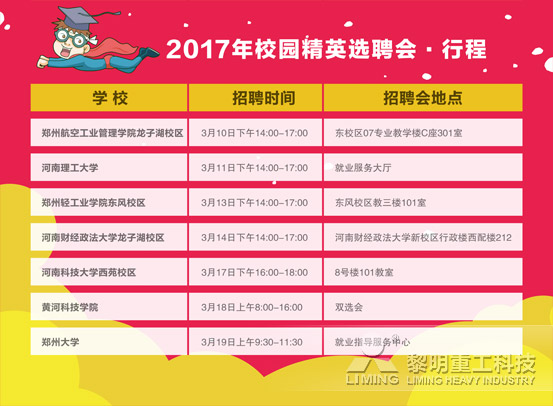 2017年,集團(tuán)鄭州公司人才引進(jìn)統(tǒng)一部署,尋找共同的事業(yè)伙伴加入我們。在接下來的一段時(shí)間內(nèi),黎明重工HR團(tuán)隊(duì)將相繼走進(jìn)鄭州航空工業(yè)管理學(xué)院、河南理工大學(xué)、鄭州輕工業(yè)學(xué)院、河南財(cái)經(jīng)政法大學(xué)、河南科技大學(xué)、黃河科技學(xué)院以及鄭州大學(xué)等知名學(xué)府展開2017春季校園招聘宣講會(huì),屆時(shí)您將可以近距離與我們的HR交流更多詳細(xì)信息。