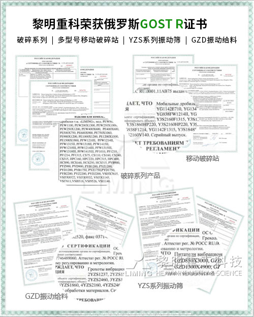近日,黎明重工科技破碎磨粉系列的百余種型號產品通過了俄羅斯質量認證—GOST認證,成為繼CE認證后的第二個國際質量認證。