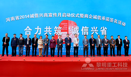 近日,黎明重工受邀參加“河南省2014誠信興商宣傳月”啟動儀式暨商企誠信承諾簽名活動。在河南省各廳局領(lǐng)導(dǎo)、各誠信經(jīng)營示范單位和誠信企業(yè)家代表、新聞媒體記者等現(xiàn)場簽名與誠信宣言的見證下,黎明重工與300余人一起,正式開啟了宣傳月的誠信之旅。